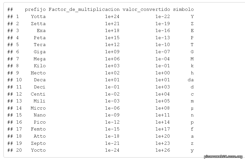 ![]() Para usar la tabla se tener la magnitud fisica a convertir digamos 100 metros, luego se mutiplica dicha unidad por el valor del prefijo que se quiere usar, luego se obtiene el resultado. Recordar que la tabla usa notacion cientifica, en donde para abreviar los ceros, se pone el 10, la base numerica, elevada a un exponente. En el ejemplo el resultado seria: ![]() La tabla se realizo con lenguaje de programacion R. Se dejara el codigo disponible en los archivos para descargar codigo de prefijos en R |