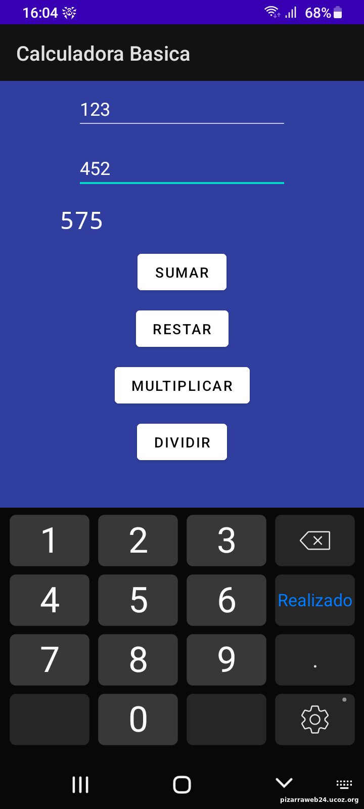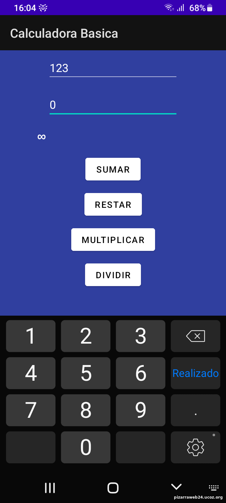 | Hola queridos seguidores, pongo a su disposicion una app en android. Es una calculadora basica. Se debe descargar el archivo apk e instalar la aplicacion. La ventaja de esta aplicacion es que no necesita internet para su uso, ademas se puede instalar en versiones antiguas de android. Adjunto algunas capturas de la misma Esta es la portada de la calculadora ![]() El uso es muy simple, se pone los numeros en los espacios donde dice numero1 y numero2, luego se presiona los botones de suma, resta, multiplicacion o division segun sea el caso, por ejemplo: ![]() Se agrego el caso de algunos casos especiales como la division a cero ![]() Se realizaran actualizaciones de la app de manera continua. Para instalar las actualizaciones se debera desinstalar la aplicacion primero. Version actual revisada a febrero de 2025. | |